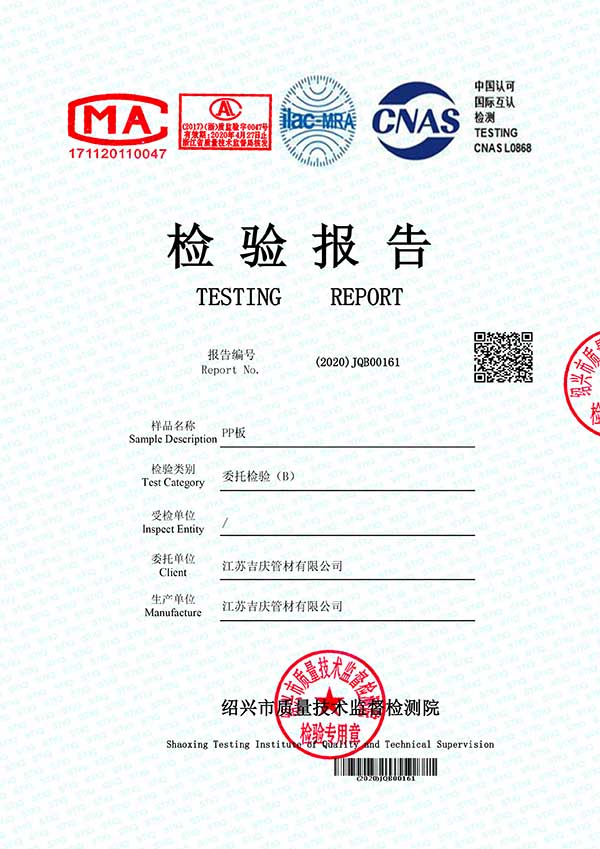 江蘇吉慶管材集團有限公司創辦于2010年2月,是pp管,pp管材,pp管件,pp風管,frpp管,frpp管材,pph管,pph管材,pph管件,pph風管,pvdf管,pvdf管材,pp儲罐,pp板材的專業化生產企業。公司占地30余畝,擁有各類資產8000余萬元,專業技術人員20余人,管材生產線10條,管件生產線11條,具備了10000余噸各類防腐塑料制品的年生產能力。公司通過了ISO9001-2000質量體系認證,同時被評為AAA信用單位,2018年公司被評為高新技術企業,此后陸續取得安全生產管理證書等榮譽。公司位于水上花園城市----江蘇省揚中市八橋鎮永福路18號,交通便捷,可直接導航至公司園區內。公司全體員工將以高度的敬業精神,嚴格的質量控制理念和科學的管理方法,及時周到的服務,竭力為我國塑料管道在各領域的推廣和應用作出更大的貢獻!